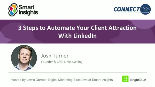In this training session, you are going to discover.... - How to tap into LinkedIn’s goldmine of high-quality prospects and automate the process to turn them into sales appointments. - The single most important hack that entrepreneurs, sales professionals, and marketers need to know to have success on LinkedIn. - Exactly what you need to say (including scripts in your initial outreach to warm your prospects up and build trust almost instantly. - Time-saving tricks to avoid wasting hours every week so that prospecting and lead generation doesn't feel like your full-time job. - How to automate this entire system so that you barely have to lift a finger. - All without using any strategies or tools that violate LinkedIn's terms of service and could get your account shut down. About the speaker: Josh Turner, Founder and CEO of Connect 365, is a WSJ best selling author and a leading expert in growing your business using LinkedIn & email. Josh has created tools and systems to help his clients get leads and clients almost completely on autopilot.