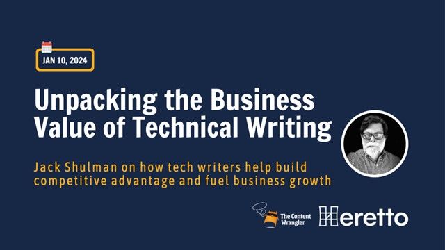 Join us for "Unpacking the Business Value of Technical Writing" for an introduction to the critical and strategic, yet quiet role that technical writing plays in building competitive advantage and fueling business growth. Management Consultant Jack Shulman unpacks the intrinsic commercial value of effective technical writing to organizations. Can’t make it? Register, and we’ll send you a link you can use to watch a recording when it’s convenient for you. This program is brought to you by The Content Wrangler and is sponsored by Heretto, a powerful component content management system (CCMS) platform to deploy help and API documentation in a single portal designed to delight your customers.