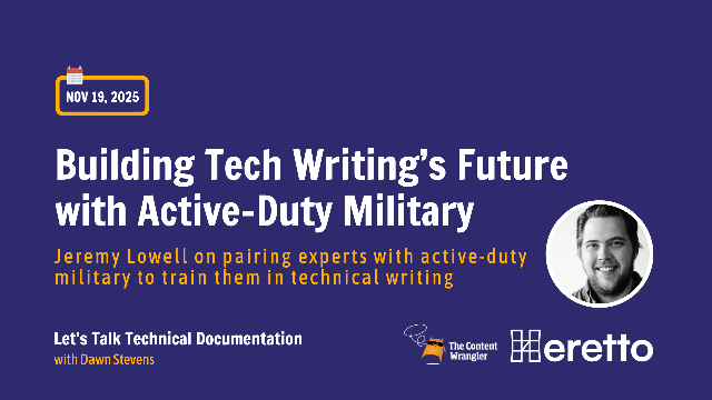 Active-duty service members bring discipline, systems thinking, and mission focus—the same traits great technical writers need. In this session, host Dawn Stevens talks with military veteran and entrepreneur Jeremy Lowell about The KYO Group’s DoD SkillBridge program, which pairs industry experts with active-duty military to train them in technical writing and place them on client projects. You’ll hear how SkillBridge works, what makes a strong training track for tech writing, and how hiring managers can tap this pipeline to build capability fast while creating real pathways for veterans transitioning to civilian roles.