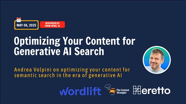 Unlock the secrets of making your content thrive in the era of generative AI search with Andrea Volpini, CEO and co-founder of WordLift. Discover how to transform your content strategy to leverage semantic search technologies that prioritize context and meaning over mere keywords. In this informative one-hour webinar, Andrea will level up your SEO approach in the era of generative AI. You'll learn about the importance of optimizing your content not just for human eyes but also for AI agents who are increasingly conducting searches on behalf of users. Expect practical tips on enhancing your content's visibility and effectiveness in a landscape dominated by AI-driven search tools. Andrea will provide actionable insights that can be applied immediately to ensure your content stands out in this dynamic new environment. This educational web presentation is brought to you by The Content Wrangler and sponsored by Heretto, a powerful component content management (CCMS) platform for deploying help and API docs in a single portal designed to delight your customers. Can’t make it? Register, and we’ll send you a link you can use to watch a recording when it’s convenient for you.