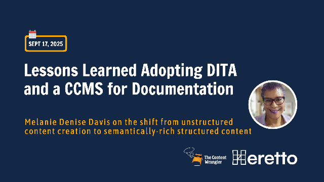 Embark on a transformative journey into the world of structured content with Melanie Denise Davis, Founder and CEO of Dragonfly Diva Docs. Discover how your tech docs team can shift from traditional unstructured content creation to leveraging the power of semantically-rich structured content managed in a component content management system (CCMS). Melanie will share invaluable insights and lessons learned from real-world implementations of structured content systems. Learn about the challenges faced, strategies employed, and best practices that emerged through these transitions. This session is crucial for organizations considering or currently adopting a CCMS for their technical documentation. Gain practical advice on building a compelling business case and understand key considerations to ensure successful adoption and maximize ROI. This educational web presentation is brought to you by The Content Wrangler and sponsored by Heretto, a powerful component content management (CCMS) platform to deploy help and API docs in a single portal designed to delight your customers.