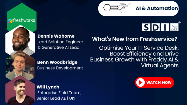 What's New from Freshservice? Freshservice is transforming IT service management by leveraging Freddy AI to solve complex business problems while driving efficiency and productivity within your organisation. With seamless automation and integrations across IT and employee service ecosystems, Freshservice empowers IT teams to deflect more requests, accelerate issue resolution, and improve service delivery. Join this session to see how Freshservice and its Freddy AI can help your IT team:- Boost productivity by automating routine tasks, enabling agents to focus on higher-value work- Enhance employee satisfaction by providing quicker, more accurate service through AI-powered virtual agents- Drive business growth by continuously improving service delivery and operational efficiencyWe will show you how to implement Freshservice to optimise your IT service desk, reduce complexity, and deliver better outcomes, faster.