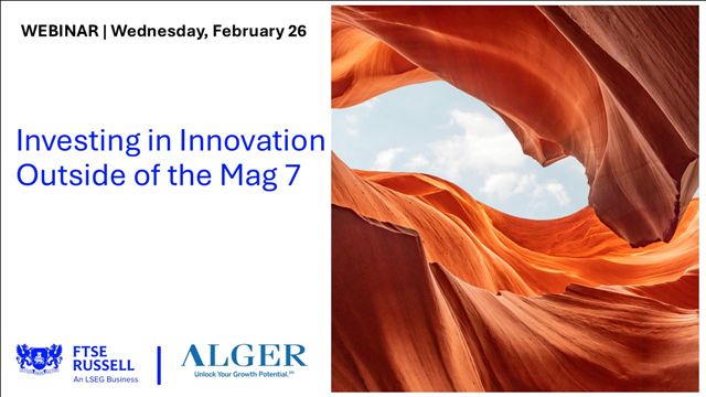 In today's rapidly evolving financial markets, disruptive technology is reshaping the landscape in ways we are only beginning to understand. The ability to innovate effectively is becoming the key determinant of success in this transformative environment. Companies that can harness innovation are poised to thrive, while those that cannot may face a decline. Investors have seen remarkable returns from the "Magnificent Seven" stocks—Alphabet, Amazon, Apple, Meta Platforms, Microsoft, NVIDIA, and Tesla. However, the pressing question now is: Can innovation be found beyond these giants? Alger and FTSE Russell have collaborated to conduct extensive research, starting with the Russell 1000 Index, leading to the development of the Alger Russell Innovation Index. This index aims to identify the next wave of groundbreaking companies. Join our upcoming webinar to explore these findings and discover potential opportunities for your investment portfolio. *** Please note that this webinar is addressed exclusively to professional investors in jurisdictions where the mentioned investment products are approved for distribution and is not for distribution to the public. Alger’s products are not sponsored, endorsed, issued, sold or promoted by FTSE Russell or LSEG. Nor do FTSE Russell or LSEG make any representation regarding the advisability of investing in any of the products. Alger is not affiliated to FTSE Russell or LSEG. ***