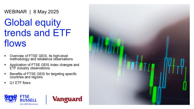 Join experts from Vanguard and FTSE Russell for a review of global equity trends & ETF flows. And the benefits of FTSE Global Equity Index Series (GEIS) for targeting specific countries and regions. - Overview of the FTSE GEIS, its high-level methodology and rebalance observations - Application of FTSE GEIS index changes and ETF industry observations - Benefits of FTSE GEIS for targeting specific countries and regions - Q1 2025 ETF flows **Please note that this webinar is addressed exclusively to investors in jurisdictions where Vanguard's products are approved for distribution. The ETF(s) presented are not sponsored, endorsed, issued, sold or promoted by FTSE Russell or LSEG. Nor do FTSE Russell or LSEG make any representation regarding the advisability of investing in any of the products. Vanguard Asset Management Ltd is not affiliated to FTSE Russell or LSEG.**