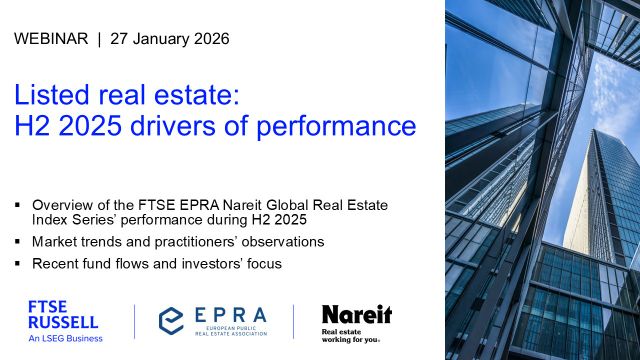 Join our panel of experts as they discuss listed real estate trends and index performance during H2 2025. Our panellists will delve into drivers of performance and share insights into recent fund flows and investors’ focus. – The right investment product starts with the right index – The FTSE EPRA Nareit Global Real Estate Index Series is designed to represent general trends in listed real estate equities worldwide. Relevant activities are defined as the ownership, trading and development of income-producing real estate. The index series covers Global, Developed and Emerging markets. In addition, the FTSE EPRA Nareit Green Index Series provide a sustainability-focused extension to the FTSE EPRA Nareit Global Real Estate Index Series. Fund managers across the global are benchmarked against the FTSE EPRA Nareit Global Real Estate Index Series. Panellists: to be announced Moderator: to be announced - Read the article "How industry collaboration drives greater access to commercial real estate": https://www.lseg.com/en/insights/ftse-russell/how-industry-collaboration-drives-greater-access-to-commercial-real-estate - More about listed real estate indices: https://www.lseg.com/en/ftse-russell/indices/real-estate